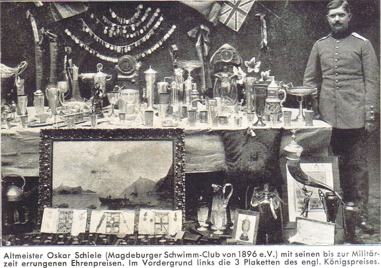 Zu Beginn des 20. Jahrhunderts zählte Oskar Schiele zu den besten Schwimmern der Welt. Geboren 1889 in Halberstadt, zog es ihn zum MSC 96 nach Magdeburg. Mit dem Verein im Rücken errang er 700 Siege, gehörte zur deutschen Olympiamannschaft und gewann zahlreiche Pokale. Zwischen 1905 und 1913 sicherte er sich mehrfach den Englischen Königspreis und speiste sogar gemeinsam mit dem englischen König. Der Preis wurde im Freiwasser über 150 Yards Brust und 440 Yards Freistil ausgetragen.
